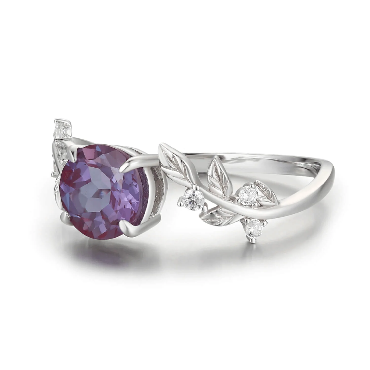 Embrace the magic of transformation with this leafy alexandrite ring, a nature-inspired masterpiece designed for those in the midst of becoming. Featuring a stunning round alexandrite that shifts color from violet to teal-green in different lighting, it captures the enchantment of change and mystery.