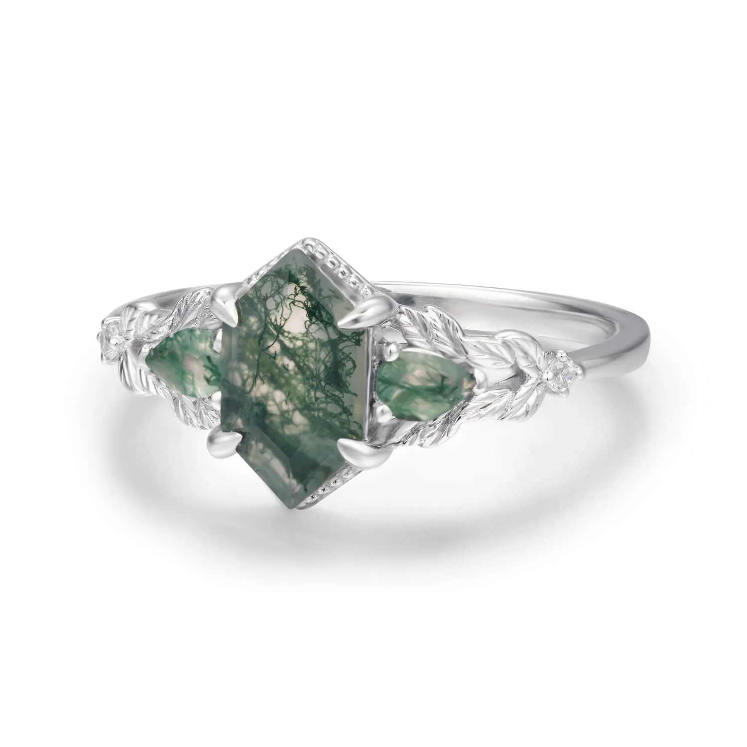 It is flanked by two pear moss agate side stones and delicate leaf-shaped detailing, capturing the enchantment of an ancient woodland. Each ring is uniquely patterned, making it a perfect choice for a promise ring or a meaningful gift for a nature lover or boho bride.