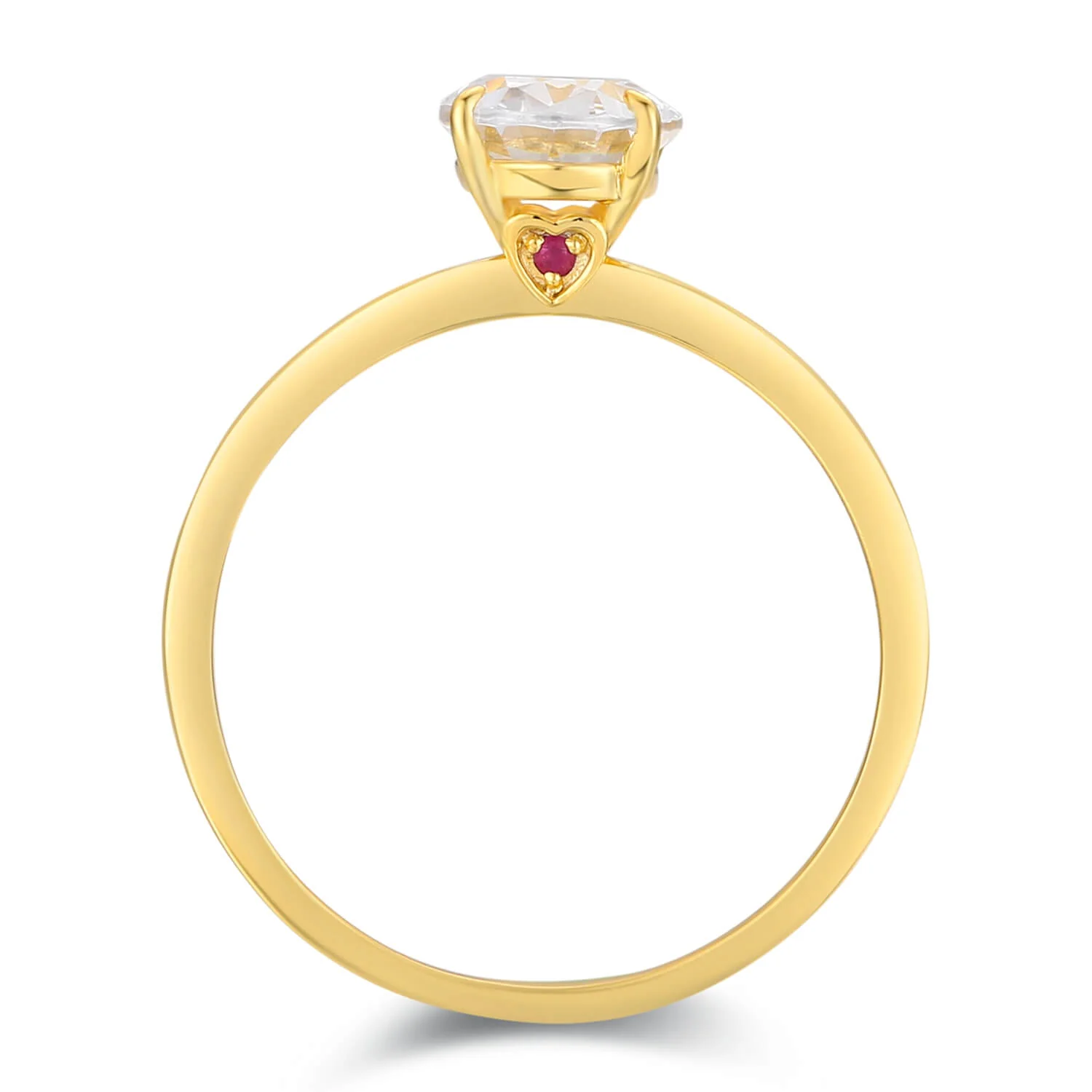At the center of this elegant solitaire ring is a brilliant oval moissanite, known for its fiery sparkle. Nestled beneath the setting reveals its most intimate and romantic detail — a tiny heart-shaped bezel delicately cradling a peekaboo vibrant round red ruby.