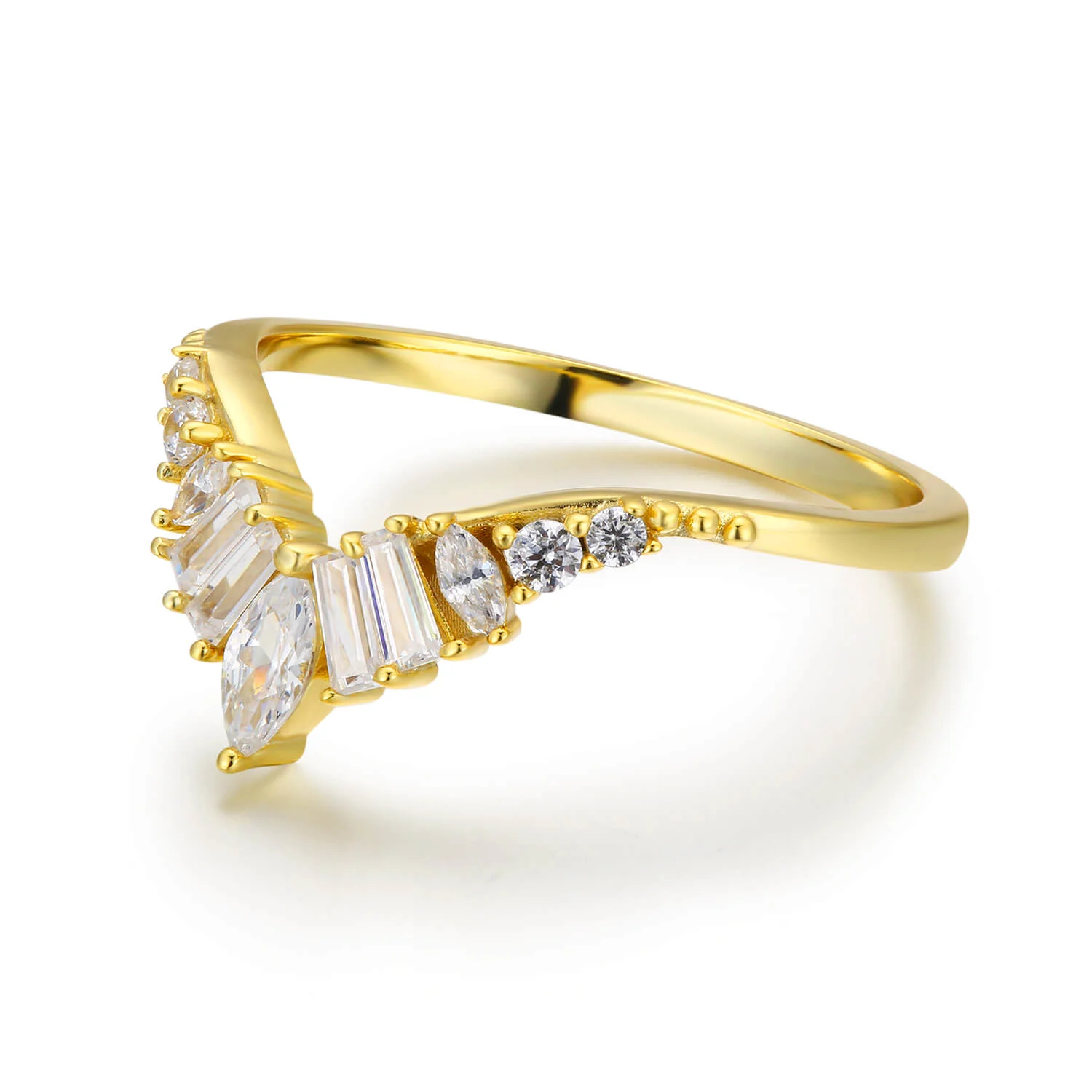This elegant chevron-style band features a stunning mix of marquise, baguette, and round-cut white topaz stones, arranged to create a soft, eye-catching V shape. The design symbolizes direction and unity, perfect for marking a special moment or celebrating everyday love.
