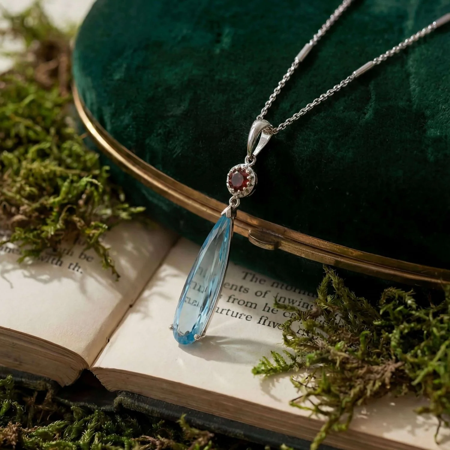 Crafted with a fiery round-cut red accent stone and a gracefully elongated faceted sky blue topaz pendant, this necklace is a nod to the iconic imagery of the film—flame and earth, heart and home. The serene glow of the sky blue stone evokes the open skies and boundless magic of Ingary, while the glowing red stone hints at the fire demon’s eternal spark.