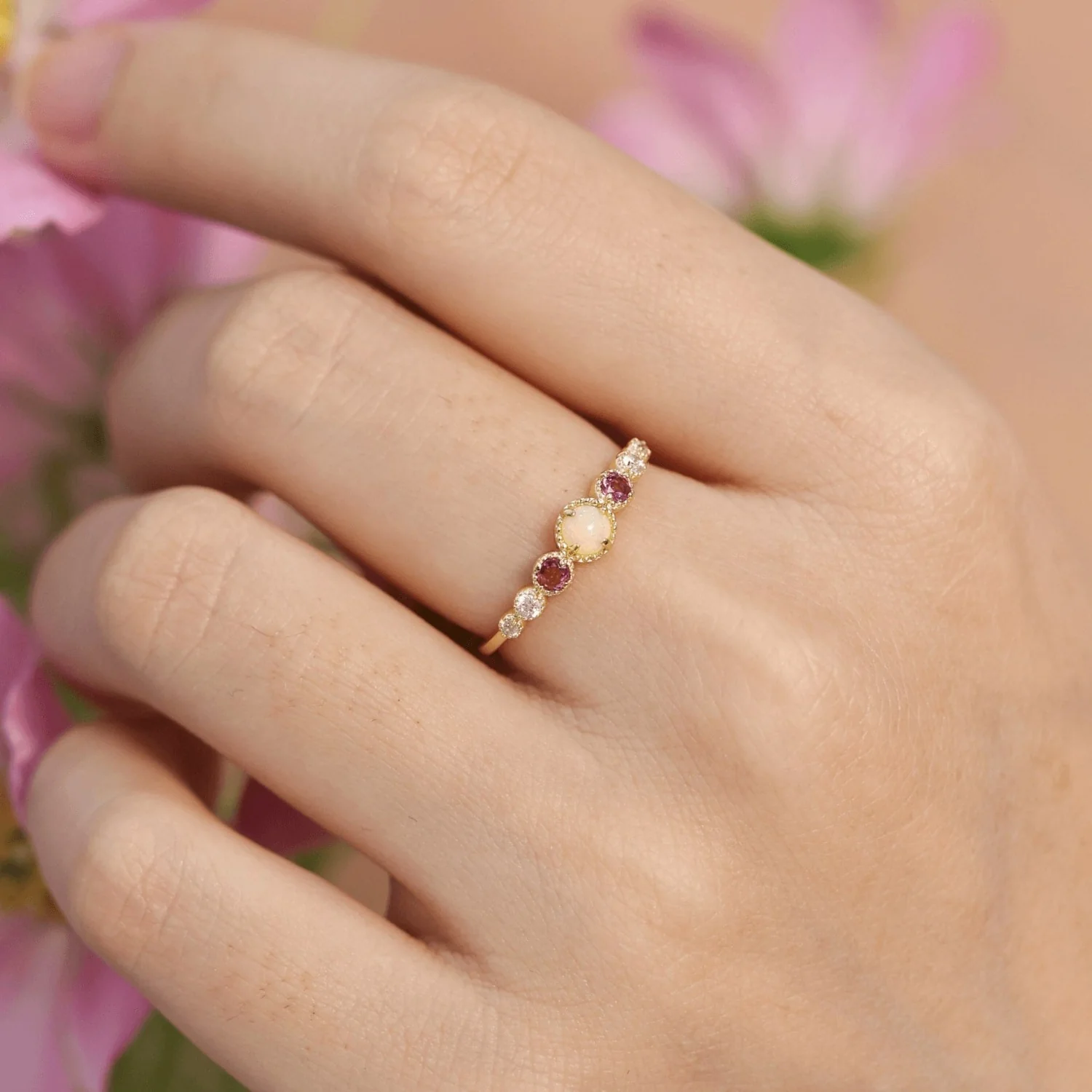 A luminous opal sits at the center of the ring, its colors shifting effortlessly with the light. Pink tourmaline flanks it with soft, romantic tones, and diamond-like accents glitter like stars guarding a glowing horizon.