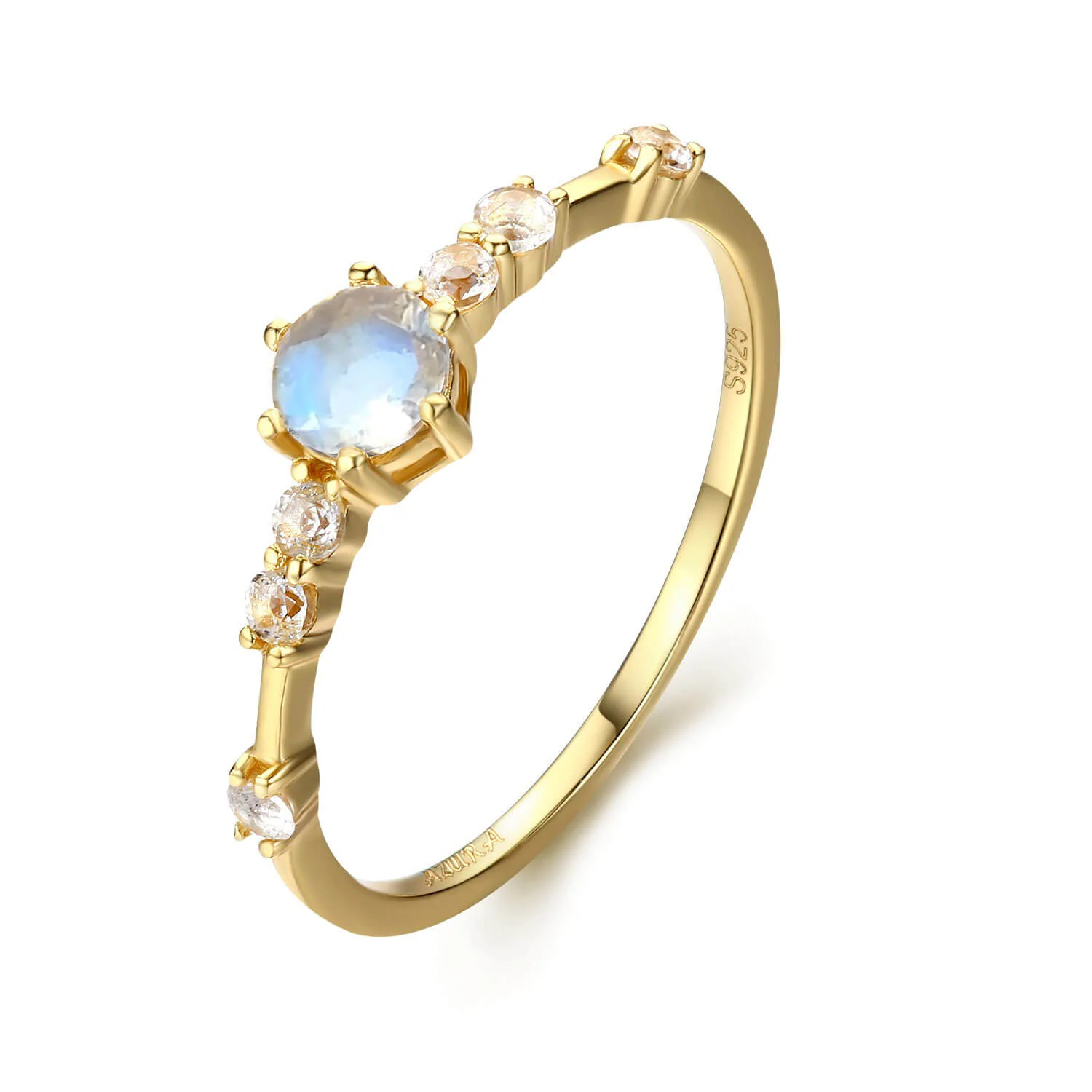 At the core lies a radiant moonstone, famed for its soft, shimmering glow that mirrors the gentle light of the moon—an ancient symbol of intuition, emotional balance, and spiritual clarity. Six equal-sized white gemstones orbit the band gracefully like a galaxy.
