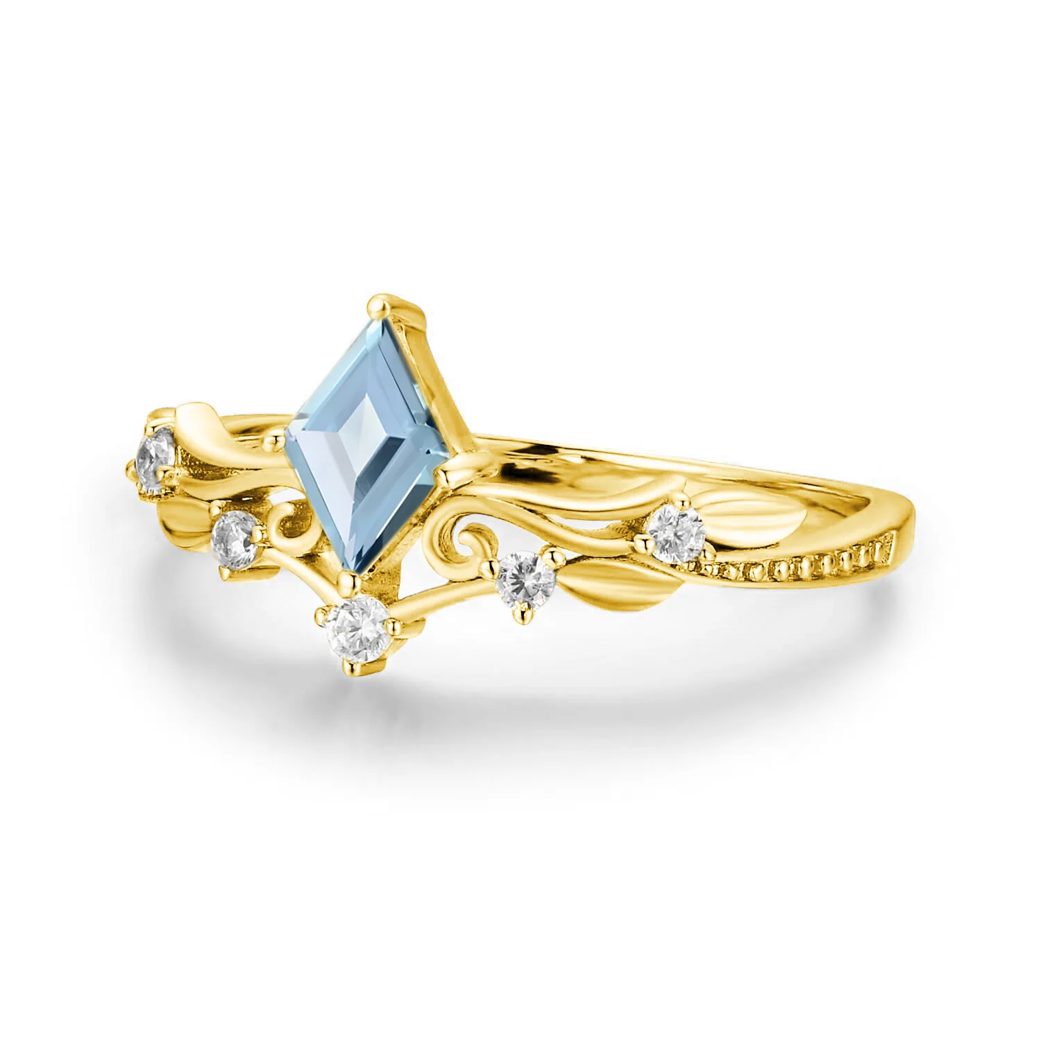 Surrounded by dazzling white accent stones that extend along the intricately crafted band, this ring evokes the delicate artistry. The detailed swirling patterns and leaf motifs add an air of sophistication.